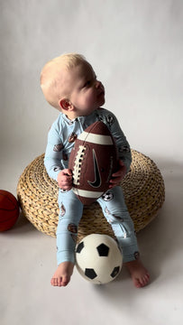 Your little one will be extra cozy and cute in our Bamboo Zipper Romper! Made from buttery-soft, breathable bamboo fabric, this charming romper features an adorable blue sports print, perfect for your little one.
